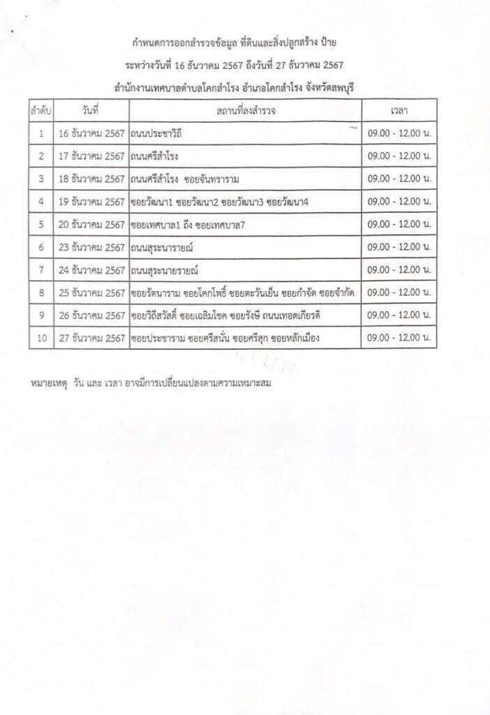 กำหนดการออกสำรวจข้อมูล ที่ดินและสิ่งปลูกสร้าง ป้าย