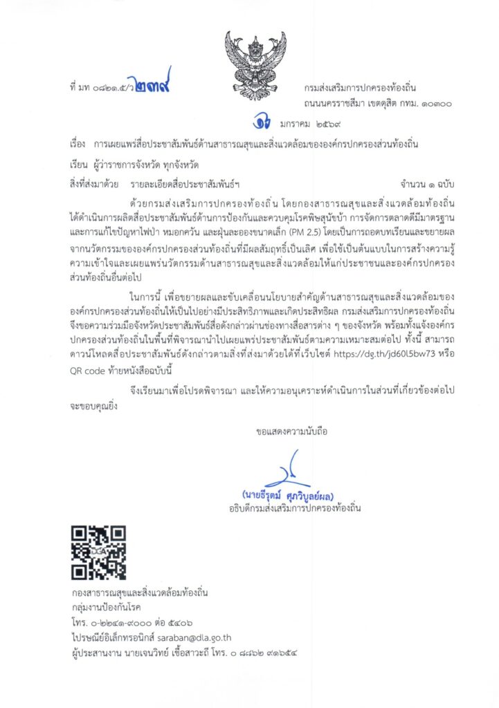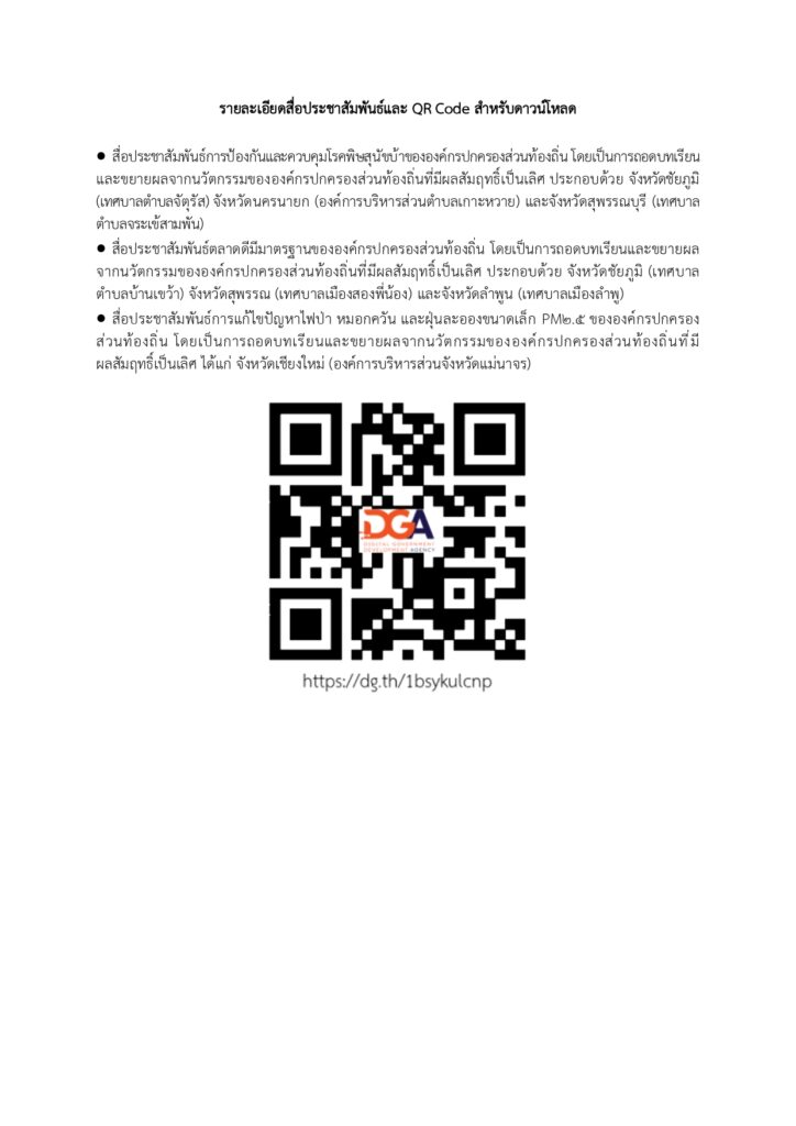 การเผยแพร่สื่อประชาสัมพันธ์ด้านสาธารณสุขและสิ่งแวดล้อมขององค์กรปกครองส่วนท้องถิ่น ได้ดำเนินการผลิตสื่อประชาสัมพันธ์ด้านการป้องกันและควบคุมโรคพิษสุนัขบ้า การจัดการตลาดดีมีมาตรฐานและการแก้ไขปัญหาไฟป่า หมอกควัน และฝุ่นละอางขนาดเล็ก (PM2.5) โดยเป็นการถอดบทเรียนและขยายผลจากนวัตกรรมขององค์กรปกครองส่วนท้องถิ่นที่มีผลสัมฤทธิ์เป็นเลิศ เพื่อใช้เป็นต้นแบบในการสร้างความรู้ความเข้าใจและเผยแพร่นวัตกรรมด้านสาธารณสุขและสิ่งแวดล้อมให้แก่ประชาชนและองค์กรปกครองส่วนท้องถิ่น สามารถดาวน์โหลด QR code ท้ายหนังสือฉบับนี้