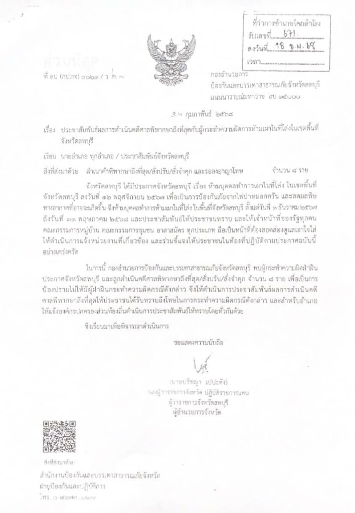 ผลการดำเนินคดีศาลพิพากษาถึงที่สุดกับผู้กระทำความผิดการห้ามเผาในที่โล่งในเขตพื้นที่จังหวัดลพบุรี